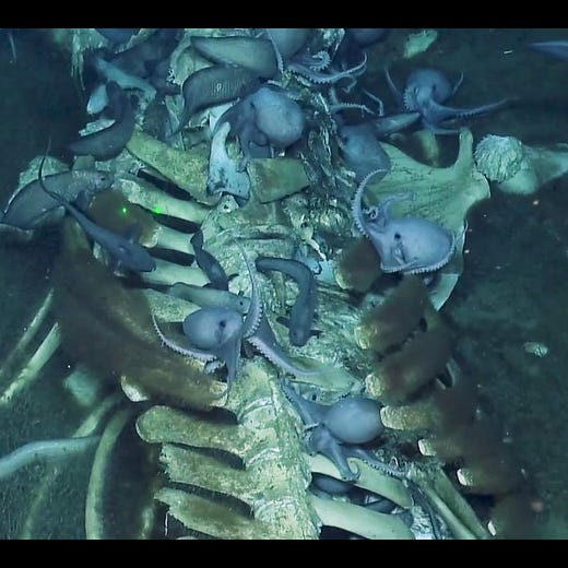 Pictured here we either have a bushel of tiny octopuses flensing the skeleton of a whale or a representation of what the health insurance industry has done to the American working class, depending on how metaphorical you’re feeling.