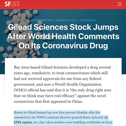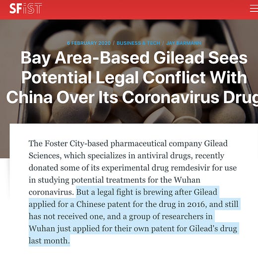 One illustrative example comes to us courtesy of Gilead, a company you might previously have heard of because of their PR crisis surrounding PrEP, the HIV prevention drug that they’re charging $1,758 a dose for. Anyway Gilead has the most promising version to date of the COVID-19 vaccine, which they plan to sell for $50 or $100 a dose, and they’re suing to prevent China from having access because they believe China would give it away for free. Perish the thought—prioritizing the health of everyone over the health of only those who can afford it!