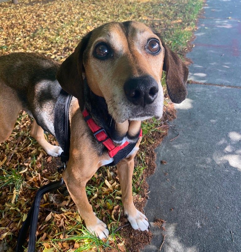 But back to luck for a moment. Scout, for instance. Scout was another of my clients this summer. I say was: “He is dead; it’s best to say it right away, because one can’t help speaking in a different way of the dead than of the living,” wrote Primo Levi. Scout was a hound of some kind or other who was found as a young dog on the side of a country road sporting a gunshot wound to the leg. Another day, another dog’s luck, a little less fight in his brain or in his genes and the story might have ended there. But it didn’t. He died last week at the age of fourteen, having gone on to live in five states. He even met Congresswoman Rashida Tlaib on one of our walks a month or two ago. His Detroit home sported a plush rug and a big comfy couch, on one of which he was always dozing when I showed up. Whatever made a mess of his life in the beginning, he came to be well loved along the way and was allowed to die with dignity when it was his time.