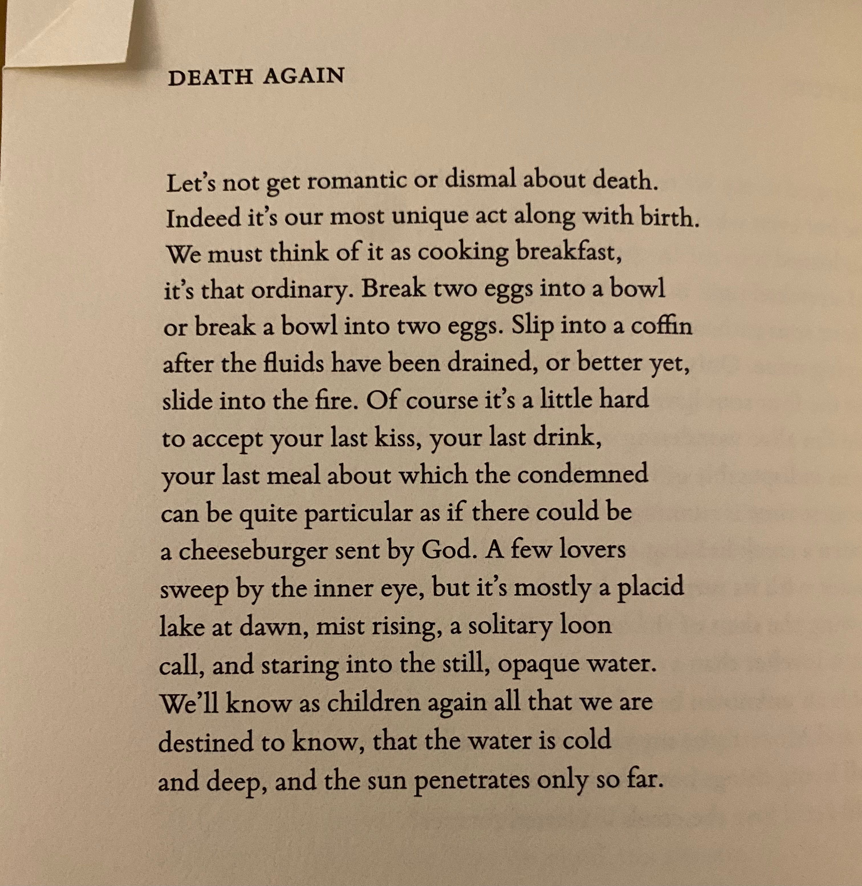 Coincidentally, our copy of The Sun magazine arrived this morning, and this month's theme appears at first glance to be death. Among a series of excerpts in "Sunbeams" on the penultimate page is this from Ursula K. Le Guin ("The Other World"): "I think ... that when I die, I can breathe back the breath that made me live. I can give back to the world all that I didn't do. All that I might have been and couldn't be. All the choices I didn't make. All the things I lost and spent and wasted. I can give them back to the world. To the lives that haven't been lived yet. That will be my gift back to the world that gave me the life I did live, the love I loved, the breath I breathed."