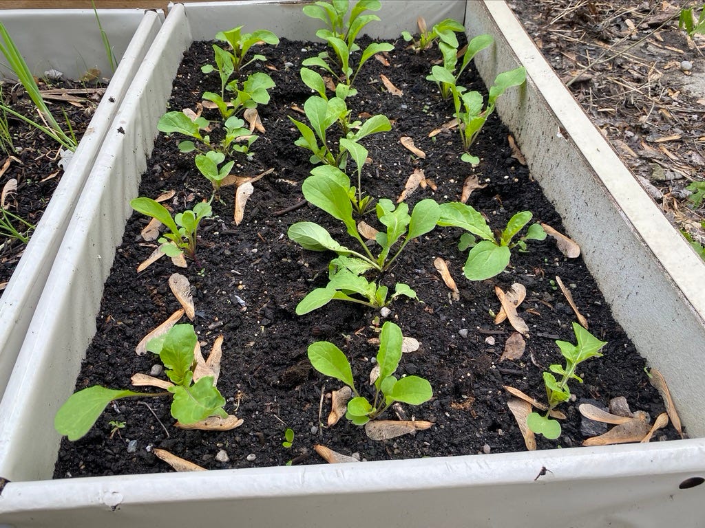 We’re learning a lot, doing this. That you can plant marigolds between your tomatoes to defend against root-rotting nematodes in the soil. That a border of anise hyssop can help combat the cabbage moths that put holes in all the brassica leaves. That besides watering and weeding and staking, even a small backyard garden requires mapping and planning and rounds of revisions to get everything in a place where it can thrive, and that this is a lot less fun than getting your hands in the dirt. That getting your hands in the dirt is a lot of fun. (Well, that one I knew.) That pulling and eating a fresh raw radish that you grew from seed is a joy worth looking forward to each May.